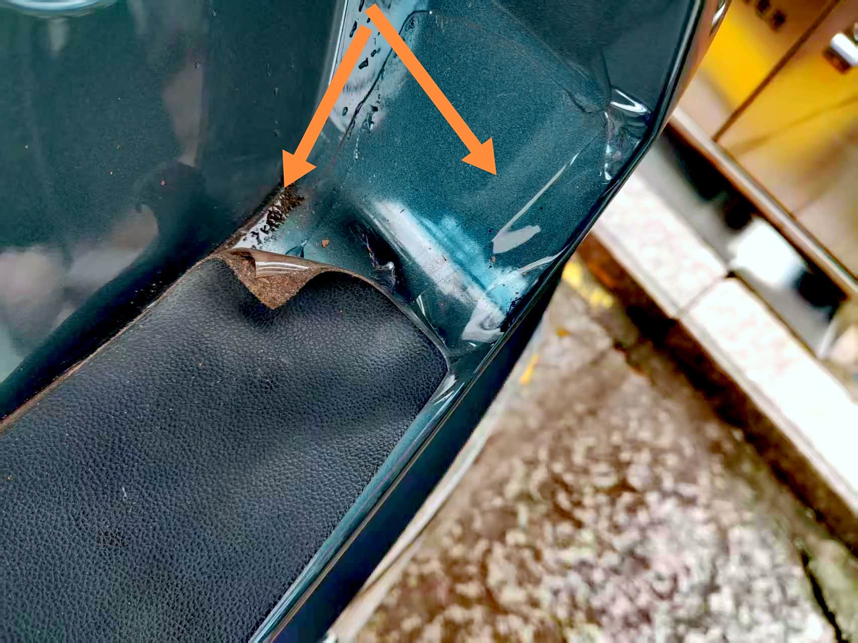 师傅建议去掉整个皮面,他说这种产品用的是热熔胶,非常容易渗透到漆面里面,导致漆面变色,他已经处理过不少,果然,撕掉后,可见大片的残胶和污垢。