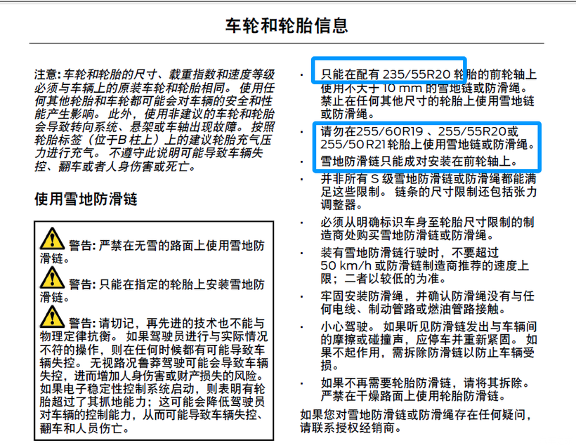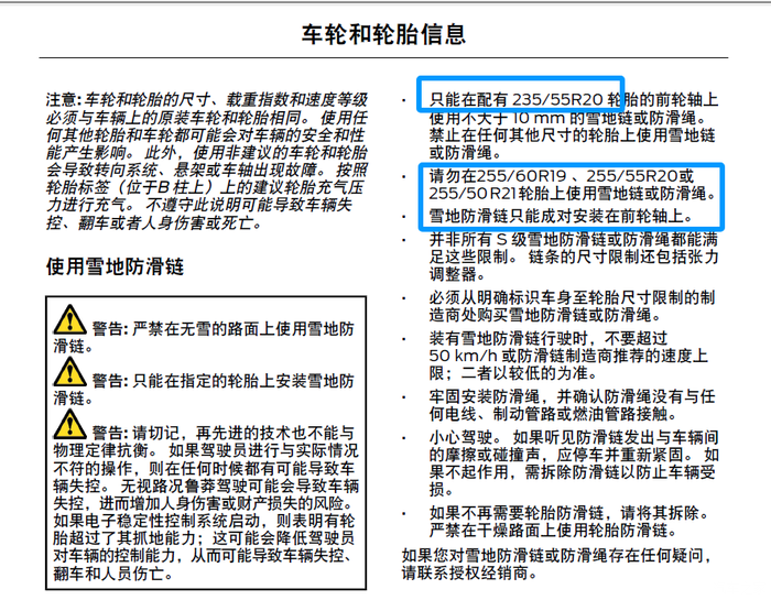 今天突然翻到了车主手册,上面写的是只能在235/55R20的车胎上安装防滑链,我看了配置,我们锐界L好像全系都没有235的尺寸。咨询长安微客服,给我回复是买雪地胎。那意思是全系都不能在原厂车胎上安装防滑链?冬季雨雪路况,只能换胎?