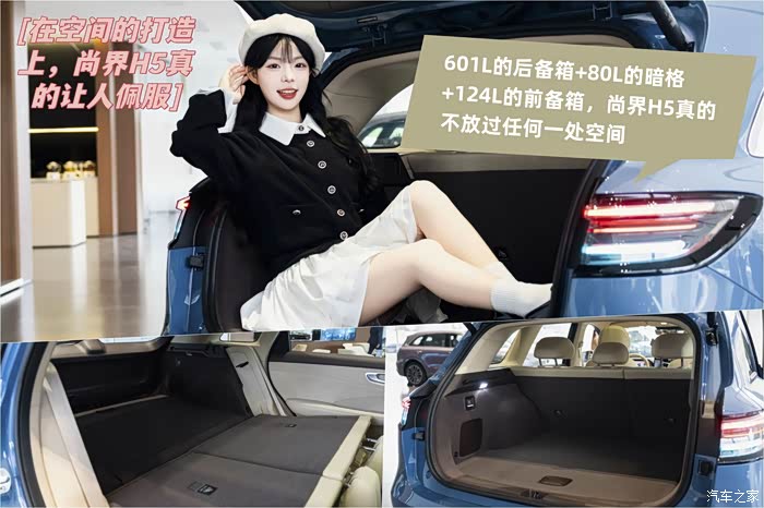 另外,尚界H5的后备箱可是大有乾坤,常规状态下,有601L的容量,无论是日常用还是出去玩都绰绰有余,而且它底下还有一个80L的暗格,平时不用的小物件都可以放在这个地方。不仅如此,它还有一个124L的前备箱,能装下一个20英寸的行李箱。
