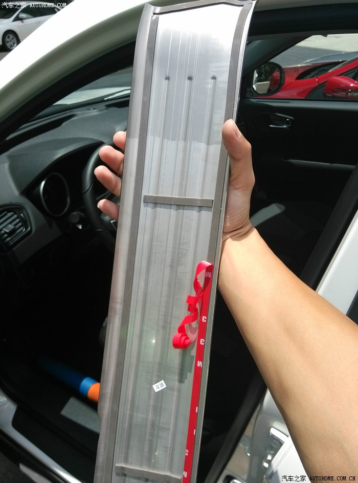 前门门槛条版型不是很完美。后端弧线部位弯得不是很贴合,还得自己扳弯一点,看到了吧,扳过了还是翘一点不够贴合,不过也差不多了,哥不是挑剔的人,能凑合就凑合吧。