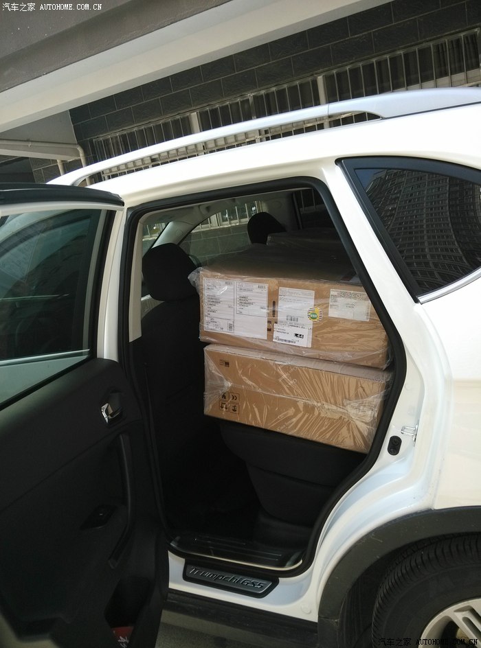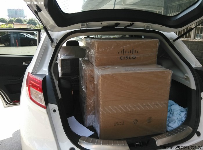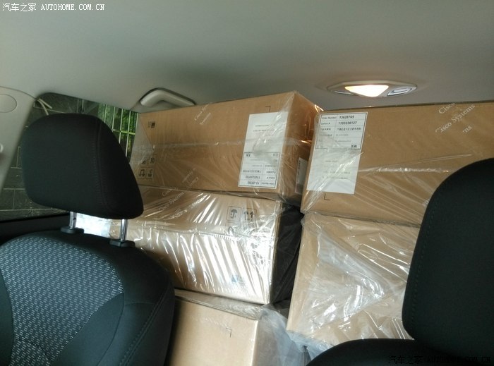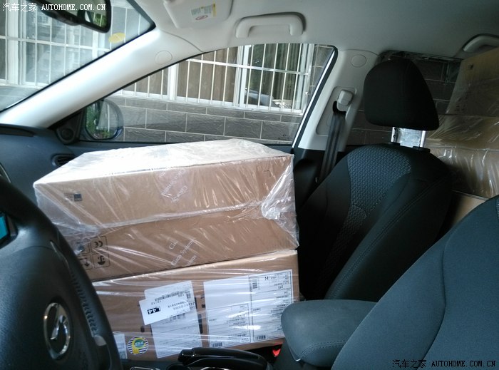 副驾也放了2个箱子。后排放倒后放了塞了10个,加副驾2个共十二个。后来观察了一下,应该还能再放2个,共塞14个。不过没得试,只有12件货。所有门口均能关上不勉强。
