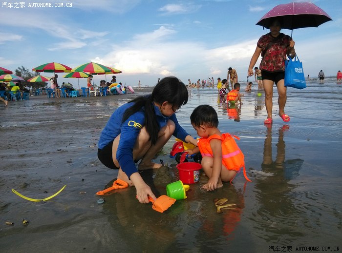 老婆带着挖沙。。。她怕晒黑,还穿外套防护起来,有时候对女人挺无语。打伞那个是我妈。总共就在海边玩了1个小时就返程了。下次还是去北海吧,防城港的沙子黑黑的,不像北海银滩的沙子白色的这么干净。而且防城港白浪滩商业开发后围起来了,不像前几年跟同事开他的飞度去,能直接开到海边(海水直接冲到轮胎),白浪滩以前叫大坪坡,就是有一个大大的非常平缓的海滩,沙地也结实,以前还有当地的人在那练车,旅客少,随便开。现在不行咯。