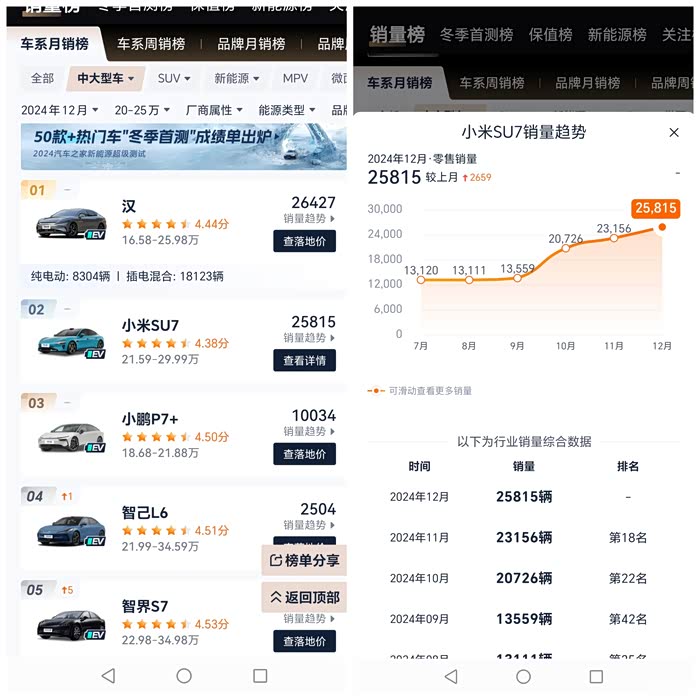 小米SU7在20-25万之间的大中型轿车中,2024年12月销量为25815,销量第二。