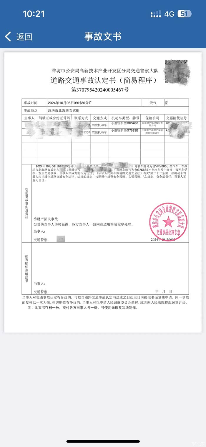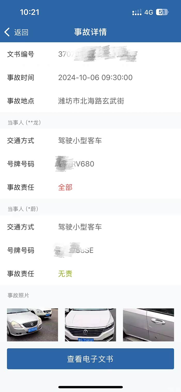 因为对方知道是自己的全责所以就主动打了报警电话,当时叔叔说可以在线上提交交通事故照片,所以这次事故责任很快就判定了。