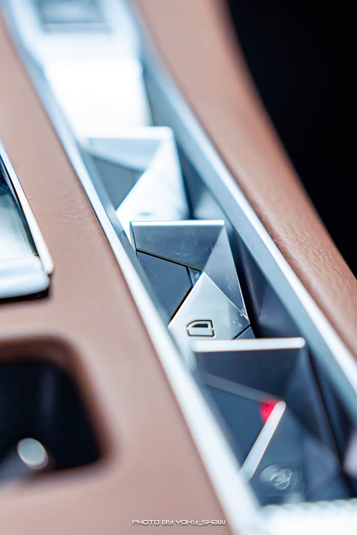 车窗的按钮是放在中控台位置,依旧是沿用了菱形线条的设计,并且采用了凹凸有致的镀铬按钮,真的细节满满~