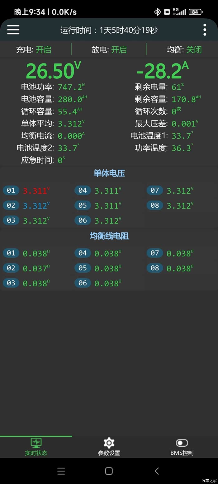 加装副电池,驻车空调选用的是8串 260安时的比亚迪磷酸铁锂原模组,整组电池内阻1.6毫欧,单体0.2毫欧。经放电测试实测容量可存7度电,搭配极空200安主动均衡保护板,可持续带5千瓦内的任何设备。空调设置标准模式26℃,广西南宁环境温度30~35,白天可连续带12个小时,晚上可超过15个小时!