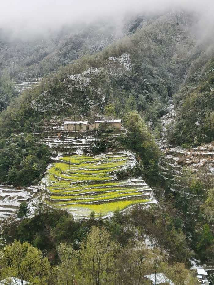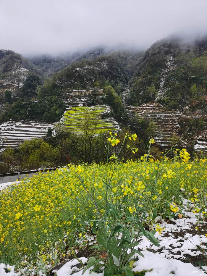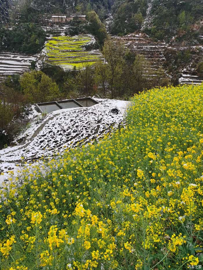 黄灿灿的油菜花梯田在雪野中分外醒目!