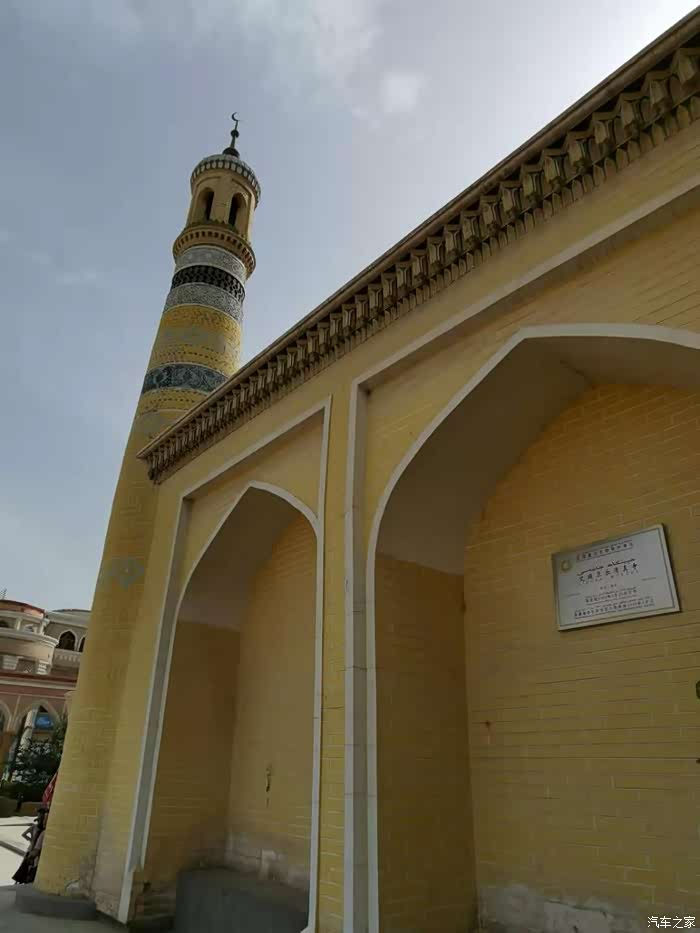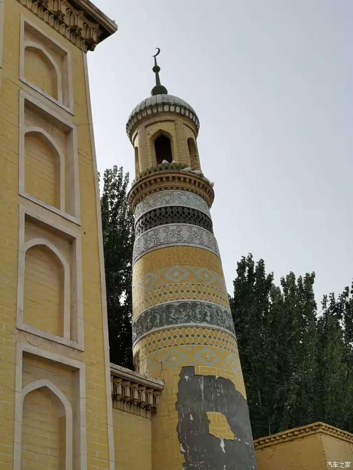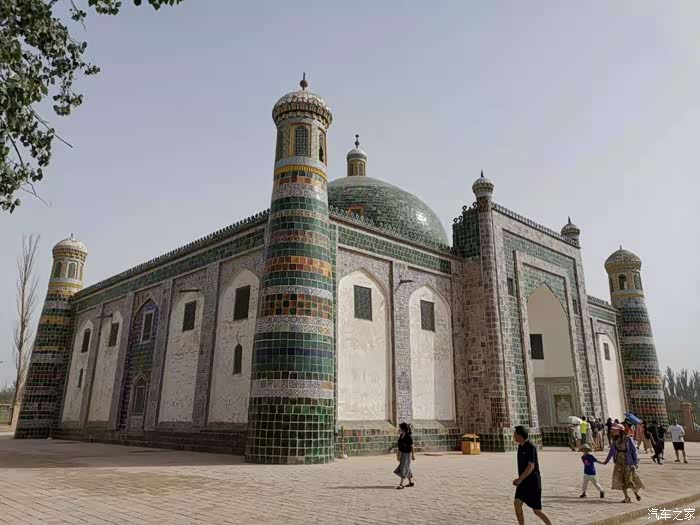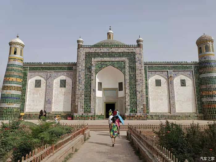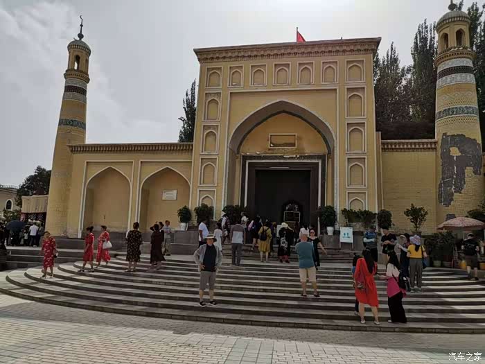 (艾提尕尔清真寺,又译为"艾提尕""艾提卡尔"。坐落于新疆维吾尔自治区喀什市的艾提尕尔广场西侧,始建于1442年,南北长140米,东西宽120米,占地总面积为1.68万平方米,分为"正殿"、"外殿"、"教经堂"、"院落"、"拱拜孜"、"宣礼塔"、"大门"等七部分,它不仅是新疆规模最大的清真寺,也是全国规模最大的清真寺之一。 在国内外宗教界均具有一定影响,为自治区重点文物保护单位。)