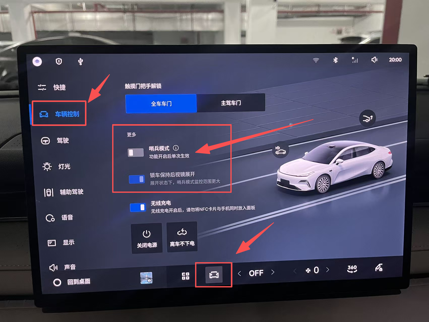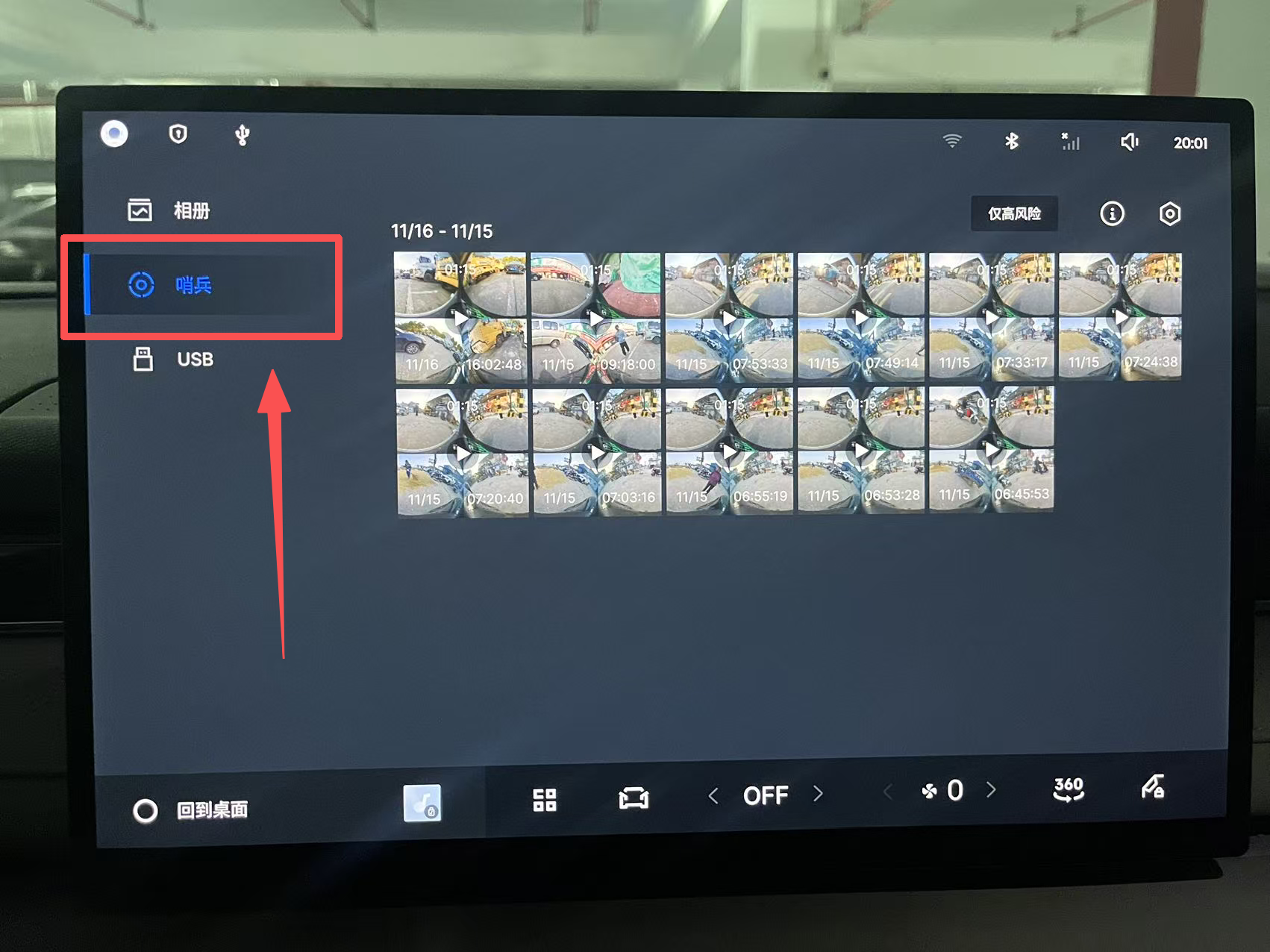 1. 车机端:先打开车辆控制里往下滑便能找到哨兵模式,这里要注意锁车关闭后视镜折叠哦(图一),查看直接打开车机上的图库(图二),找到标注“哨兵”的分类入口,点击进入后就能查看哨兵模式录制并保存的异常场景视频(图三),视频均存储在提前插入的U盘中。