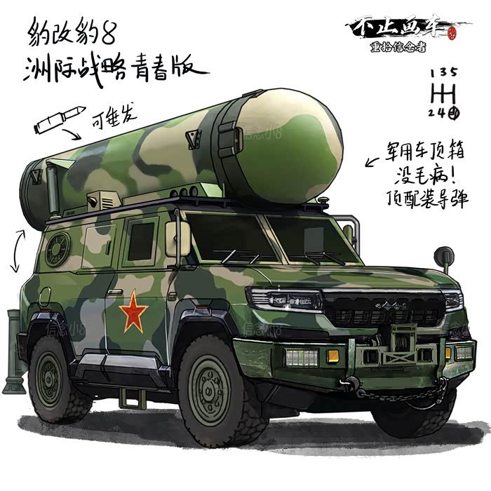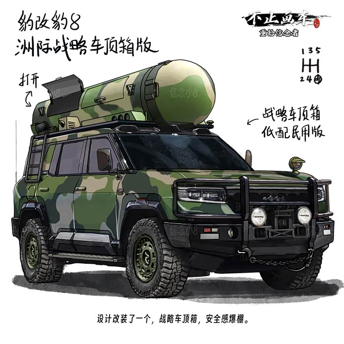 豹8外观,改军车的感觉也不错,一股正派的气息迎来。配上顶配军用车顶箱,洲际战略导弹青春版就改装完毕。
