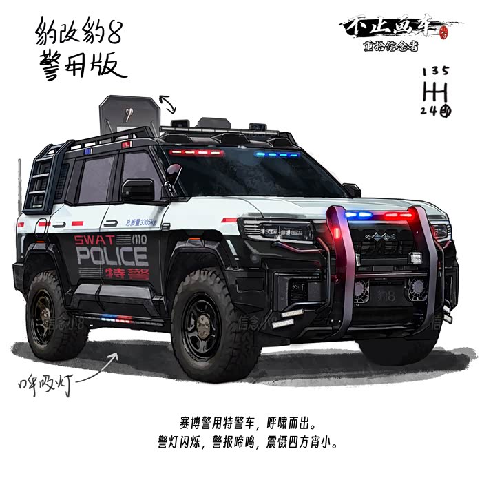 警用特警版赛博风格豹8,融合了现代警务需求与未来科技美学,是一款既实用又充满科幻感的特警装备车辆。