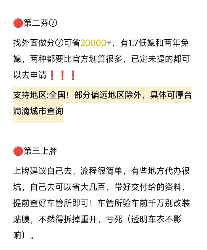 上牌建议自己去,流程很简单,有些地方代办很坑,自己去可以省大几百,带好交付给的资料,提前查好车管所即可!车管所验车前千万别改装贴膜,不然得拆掉重开,亏死(透明车衣不影响)。
