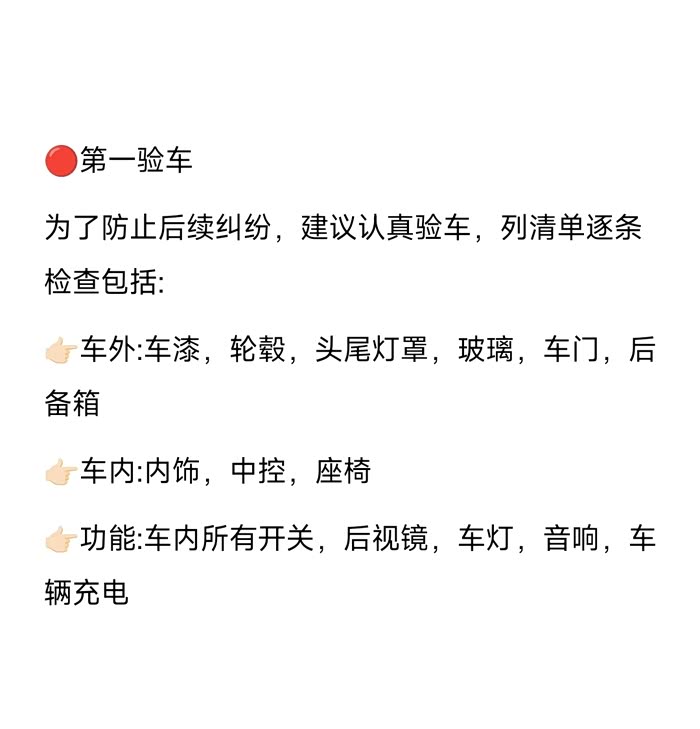 为了防止提车纠纷,建议认真验车,列清单逐条检查包括: