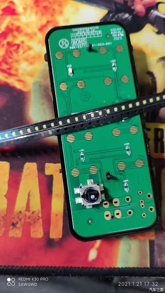 这是荣威i5主驾驶升降开关的电路板,生产日期20160716,可以看出来是有预留背光灯的,只是没有焊灯珠,我试过补焊灯珠依然不亮(应该是电路板灯珠相关的电子元器件也减配了),另外荣威i5原车开关不透光,补焊灯珠也没用,故而放弃