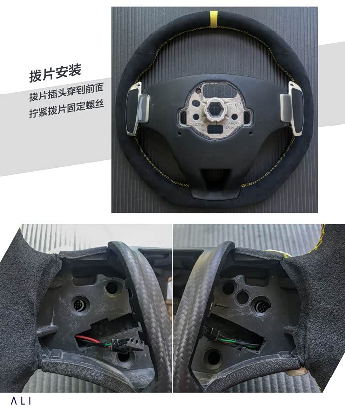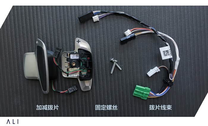 拨片买回来是没有固定螺丝的,可以自己带着拨片去五金店配两颗1.8-2厘米长的拨片固定螺丝。线束其实就是比原车上的线束多了两个拨片的(黑色)插头。
