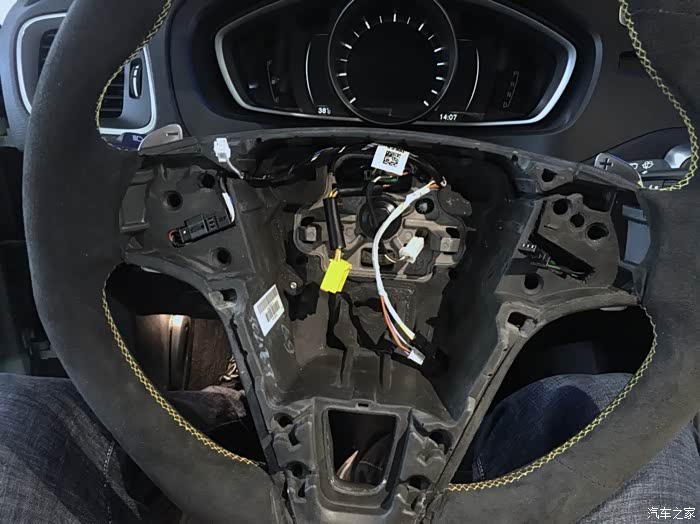 线速黑色胶皮包裹的是连接减档拨片和巡航按键的,白色胶皮包裹的则是连接加档拨片和多媒体按键。再插上绿色线束插头就开始安装气囊了,跟拆的顺序倒过就OK。