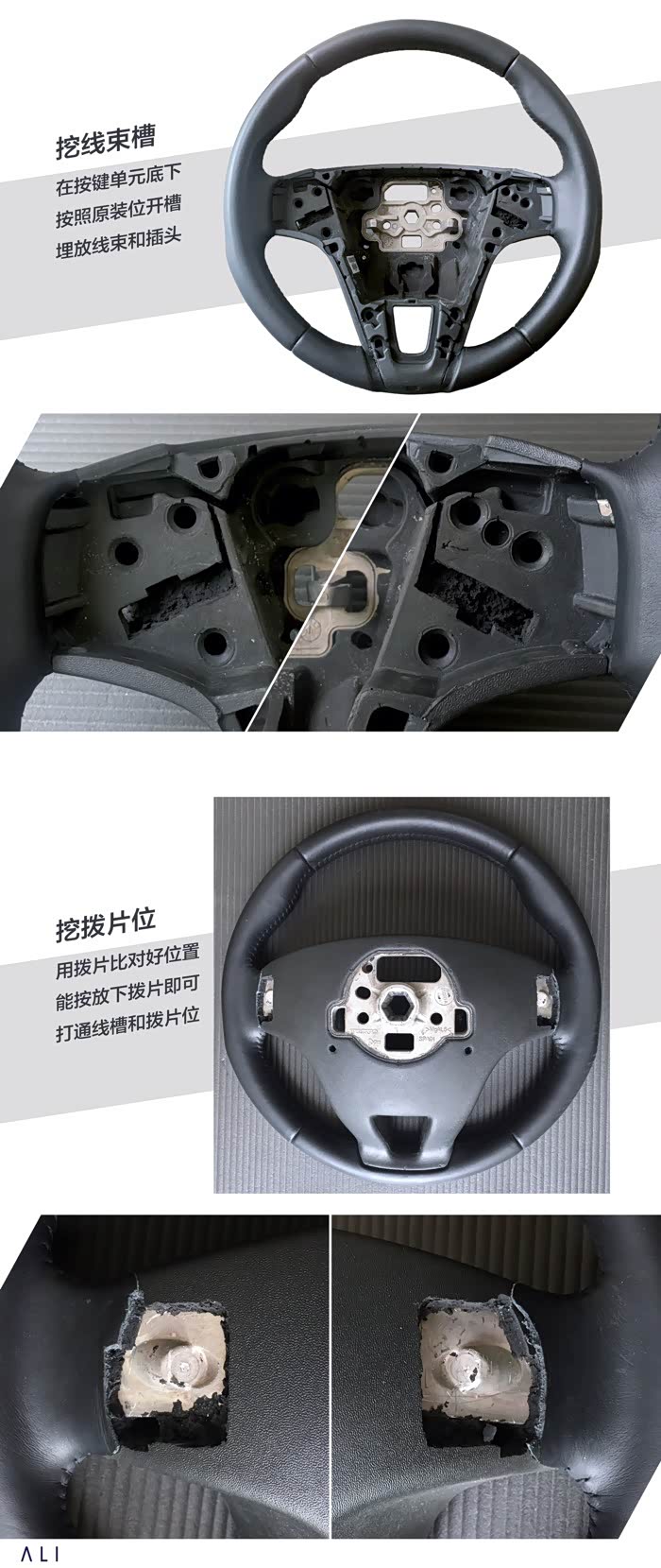 因为换挡拨片线束多了一个拨片连接的插头,所以需要在按键单元下面挖一条槽出来(我是严格按照原厂的模样挖的线槽)。