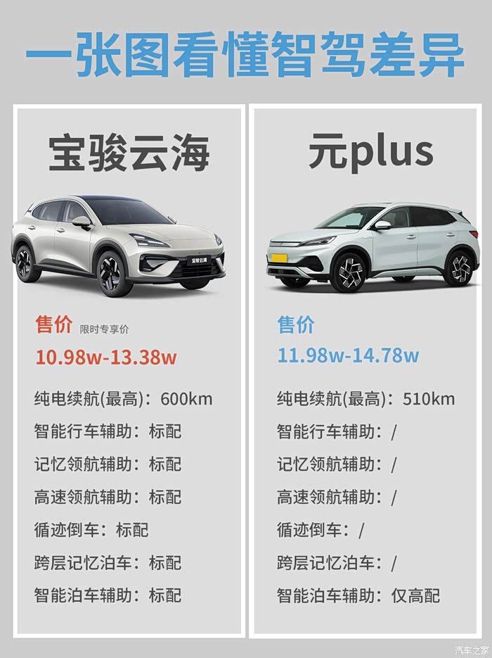 宝骏云海的轴距为2750mm,后备厢容积为567升。相比之下,比亚迪元PLUS的轴距为2720mm,后备厢容积为440升。宝骏云海在空间上具有明显的优势,尤其是后备厢容积更大,适合家庭用户。宝骏云海在续航方面表现出色,其纯电版最大续航里程达到了600公里,而比亚迪元PLUS的纯电续航最大为510公里。宝骏云海在续航能力上具有明显优势,适合长途驾驶和需要频繁出行的用户。