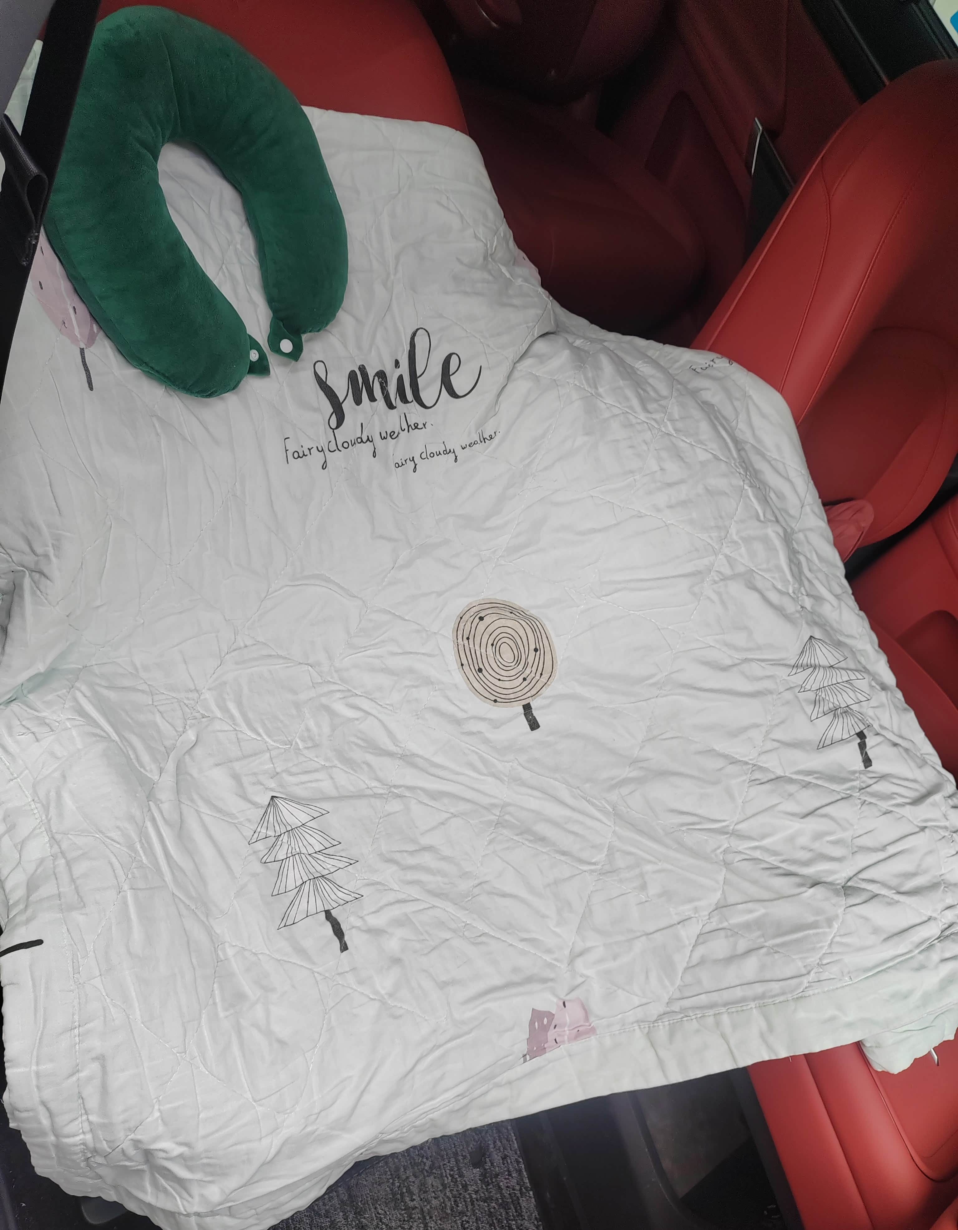 另外,车子带有座椅加热,因此,座椅加热打开,把被子铺在座椅上面睡觉会更舒服。