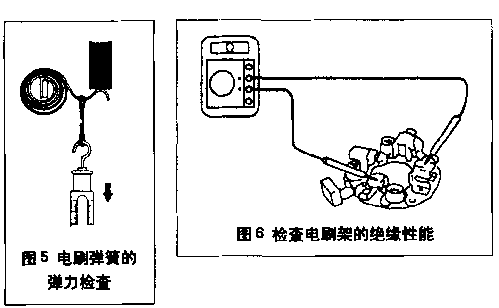 (1)检查电刷弹簧有无变形、折断等,如有应予更换。弹力检查可如图5所示用弹簧秤检查,其压紧力应符合13.7~19.6N的规定。否则应更换电刷弹簧。