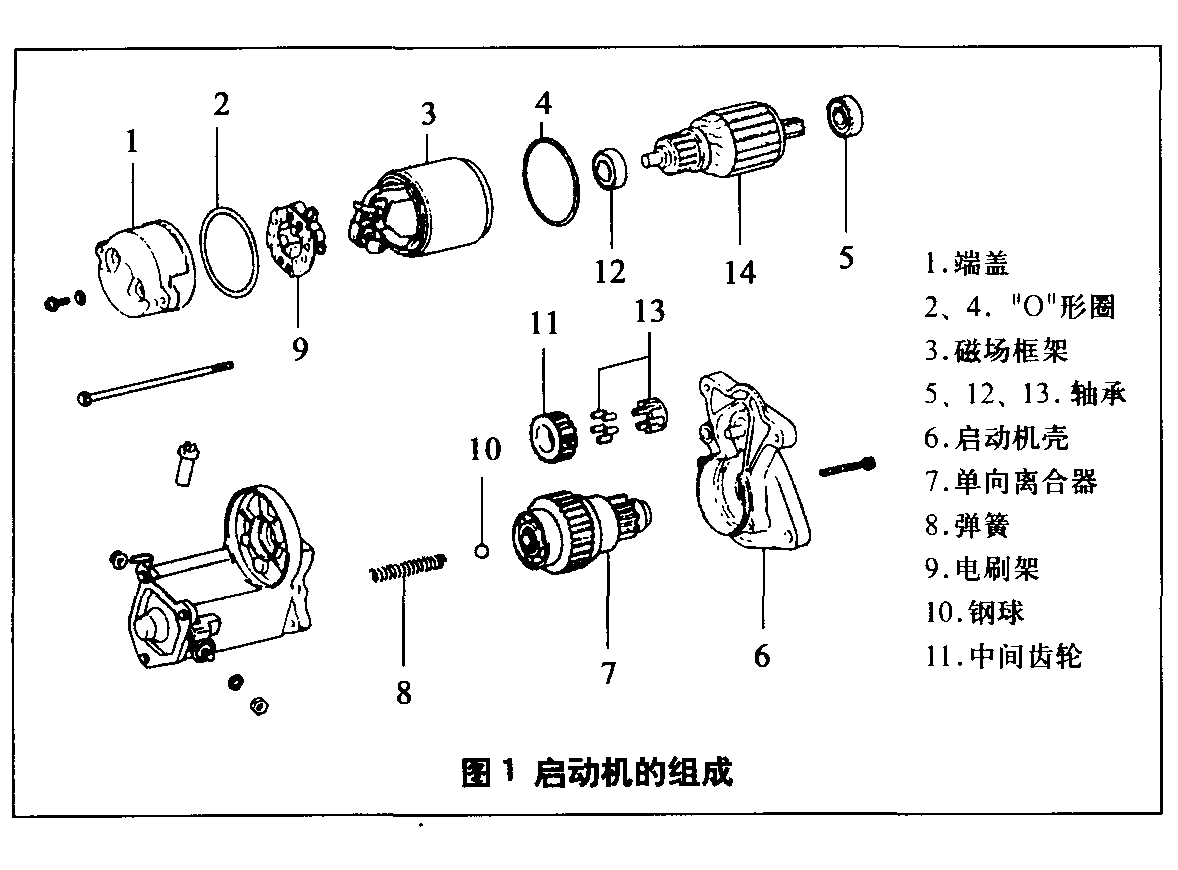 日本丰田高级轿车大都装用了减速启动机,这种启动机具有体积小、输出功率大等优点,其性能远高于非减速启动机。下面以皇冠JZSl33系列高级轿车装用的启动机为例,介绍其分解后(图1)的检修。