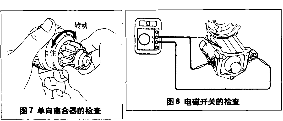 如图7所示,先顺时针转动小齿轮,应灵活、无卡滞。然后逆时针转动小齿轮,应立即卡住。如达不到上述要求,应更换单向离合器总成。