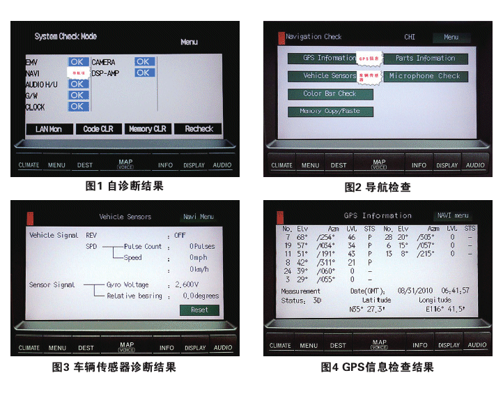 接下来仍通过自诊断功能检查GPS信号。在导航检查菜单选择“GPS INFORMATION”(GPS信息)(如图4)检查。菜单显示内容为: