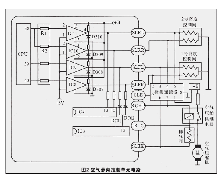 断电后故障代码不能清除,故怀疑空气悬架控制单元有故障。拆下并打开后备厢右侧空气悬架控制单元,发现电路板上有一处铜箔上的漆膜已经变色,说明空气悬架控制单元确实可能有故障。从空气悬架控制单元电路中可以看到:当空气悬架控制单元要控制2号高度控制阀时,其CPU的端子38输出5V电压,然后分两路,分别经电阻R1和R2加到集成电路IC11和IC10的2号端子上,此时两集成电路的端子4均输出12V电压,分别经悬架控制单元的端子SLRL(端子26)和SLRR(端子35)的2号高度控制阀电磁阀线圈,使该阀内部的两个电磁阀开启,从而使压缩空气能进入悬架气囊和从悬架气囊排除出。检测表明,通电时集成电路IC10的端子4无电压输出,IC11严重发热,即两块集成电路皆已损坏。