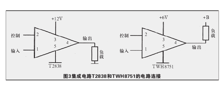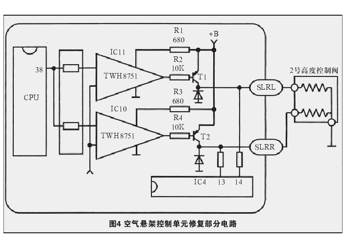 上述两块集成电路型号为T2838,用TWH8751替换。由于两者端子3的供电电压和端子4的输出方式不同,如图3所示,所以在TWH8751端子3上串联一只680Ω的电阻,并将2号高度控制阀电磁阀线圈的接地端子改接到12V电源上,然后装车试验。在CPU端子38上加5V电压时,能听到2号高度控制阀电磁阀吸合声,说明TWH8751在CPU输出信号时可以正常控制2号高度控制阀电磁阀的工作。将全部电路回复后试车。