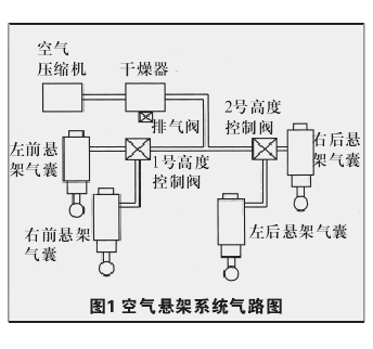 该车空气悬架系统气路如图1所示。空气经空气压缩机增压后进入干燥器,在干燥器中被过滤去水分后进入1号和2号高度控制阀,然后通过这两个高度控制阀分别控制前后4只悬架气囊。当压缩空气经高度控制阀给悬架气囊充气时,车身升高;当悬架气囊内的空气经高度控制阀及排气阀排入大气时,车身降低。当电控系统产生故障时,空气悬架系统故障指示灯闪亮,同时空气悬架系统停止工作。跨接故障诊断插座的端子TC与端子E1,空气悬架系统故障指示灯显示故障代码33和34,分别表示用于左后侧和右后侧的2号高度控制阀电磁阀线圈对地断路或短路。