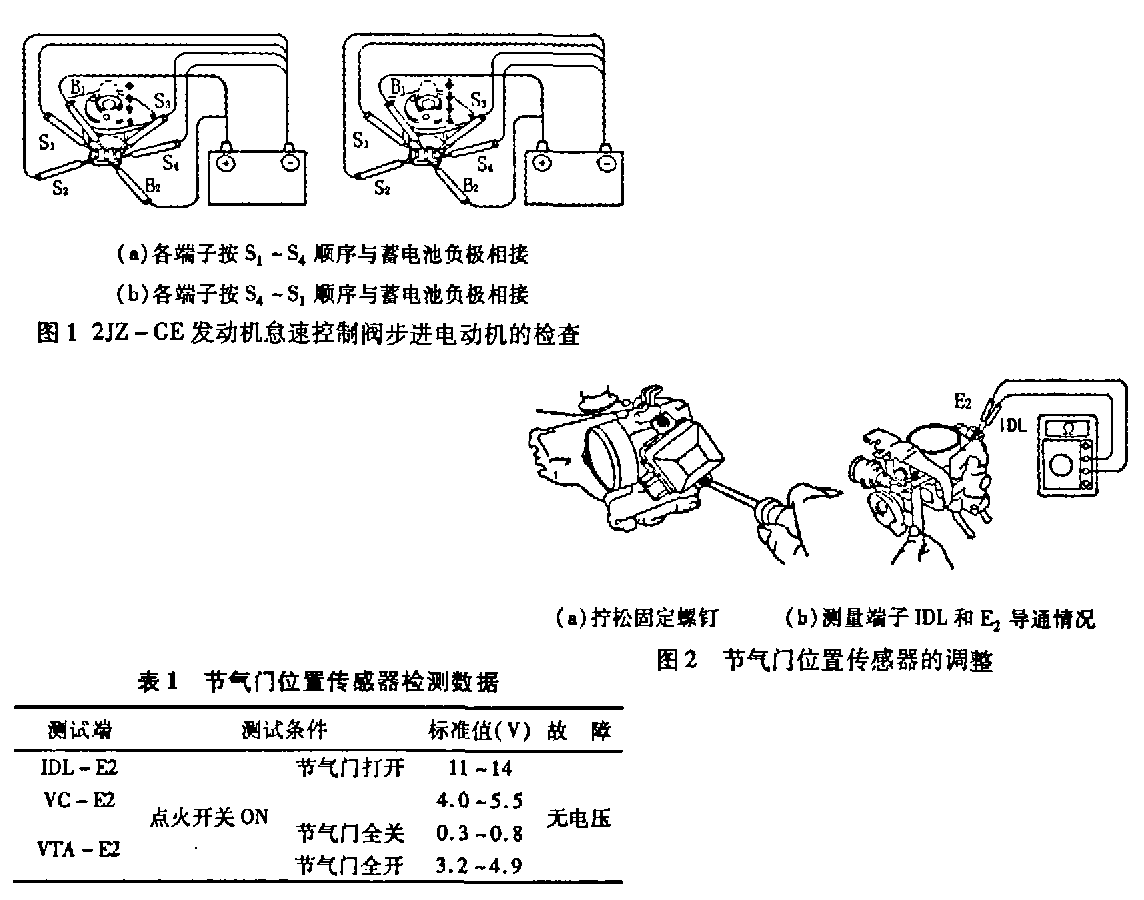 首先利用发动机自诊断系统检查发动机控制系统是否存储了故障码。用一根短接线短接检查连接器的TE1和E1两个端子,打开点火开关,仪表盘上的故障灯快速闪烁,表明无故障码存储。