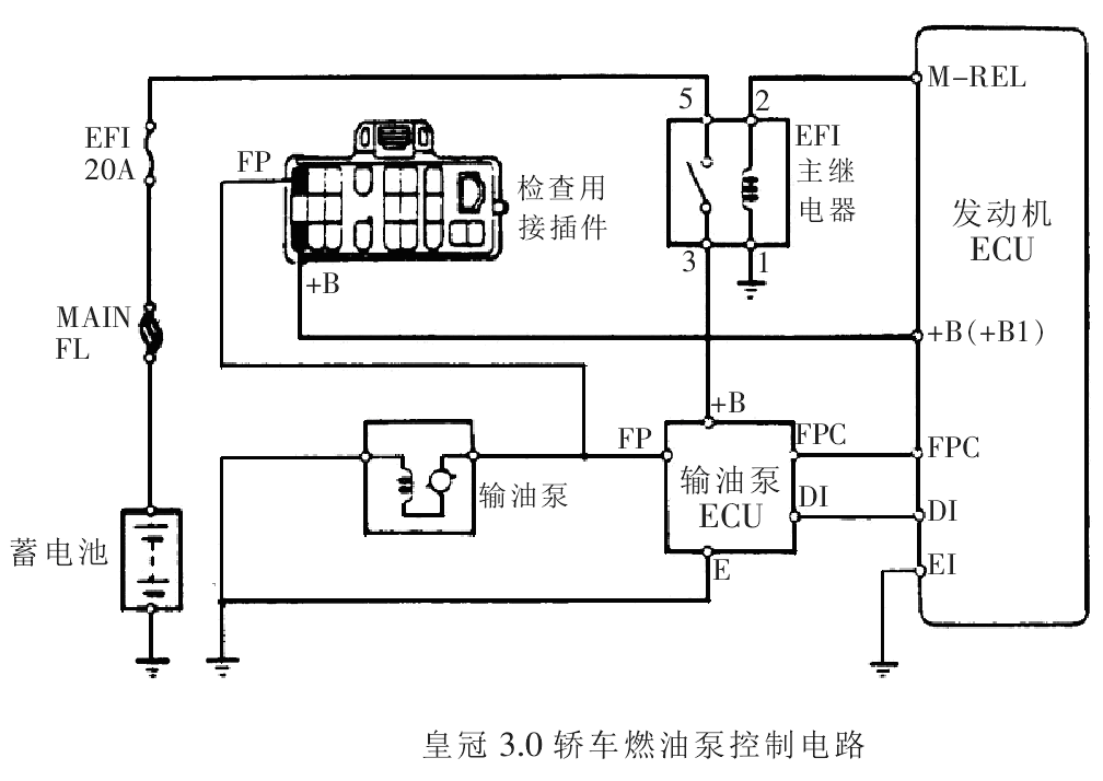 拆开行李箱内饰,在燃油箱附近找出电动燃油泵ECU,拆除电动燃油泵ECU上的线束接头,用一根导线短接发动机故障检查连接器中的+B和FP两个端子(亦可短接电动燃油泵ECU线束插头上的+B和FP两个端子),使电动燃油泵ECU不再参与工作。