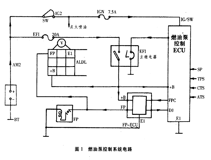 1)电动燃油泵ECU不是单独行使指挥权,而是与发动机ECU联网工作,通过发动机的水温传感器( C'I'S )、气温传感器(ATS )、节气门