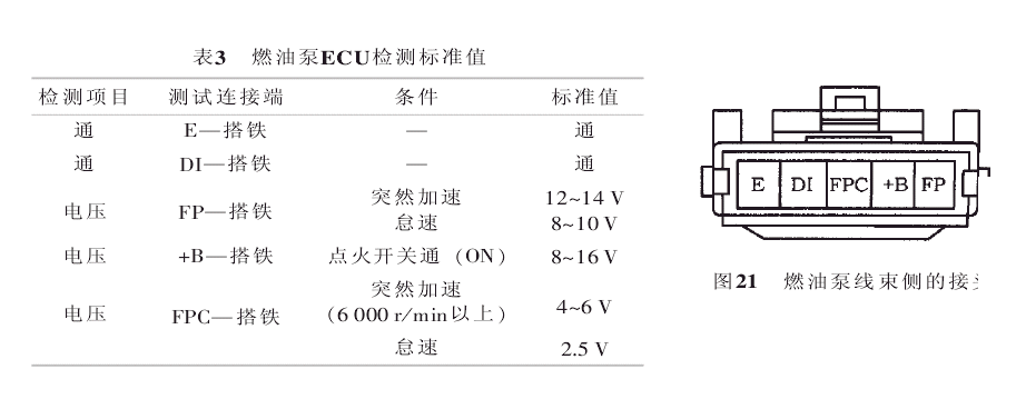再用导线短接发动机故障检查连接器中的+B和FP两个端子,并再一次拔下电动燃油泵ECU上的线束接头,测试发动机ECU之FPC端子的输出电压:起动发动机,当发动机以750r/min怠速运转时,发动机ECU之FPC端子的输出电压为8.OV(正常值为8.0~10.OV):将发动机转速突然提高到6000r/min,FPC端子的输出电压为6.2V(正常值为6.0~6.5V),说明发动机ECU之FPC端子到电动燃油泵ECU的输出电压正常。
