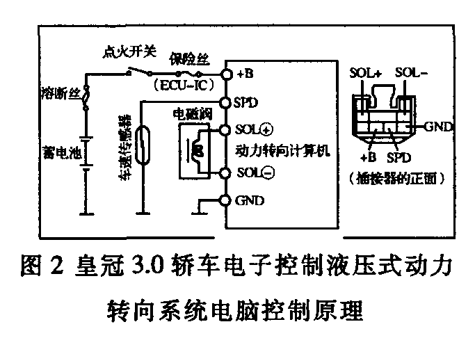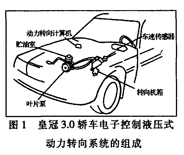 图1和图2分别表示皇冠3.0轿车电子控制液压式动力转向系统的组成和电脑控制原理。其中电控部分由车速传感器、动力转向电脑(ECU)和电磁阀组成。
