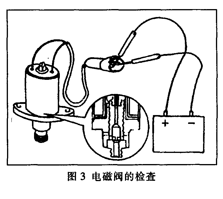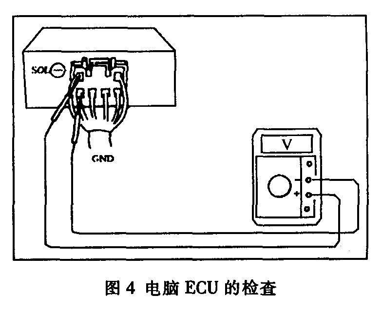 (2)电子控制机件的检查。①电磁阀的检查。拔开插接器,用电阻表测量电磁线圈的电阻。电阻应为6.0—11Ω。从转向机内拆下电磁阀,将蓄电池正极接电磁线圈的SOL+端子,负极接SOL-端子,见图3。此时针阀应缩回约2mm,否则应更换电磁阀。②电子控制液压式动力转向系统的电子控制器ECU的检查。支撑起汽车,拆下ECU插接器,起动发动机,在不拔下ECU插接器、发动机怠速运转的情况下,用电压表测量ECU的SOL一和GND两端子之间的电压(电表测笔从背面插入,见图4)。然后将变速器挂上档,并使车速达到60km/h,仍按图4所示接法再测电压,电压应比原来增加0.07—0.22v。如果无电压,应更换ECU。如果ECU损坏应更换。