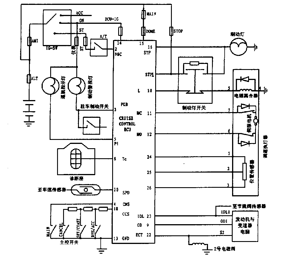巡航控制系统的发展可以大致分成三个阶段:20世纪50年代末至70年代中期,美国和日本出现了以模拟电路为基础的定车速控制系统;20世纪70年代至80年代中后期,随着单片机技术的发展,出现了以数字技术为基础的巡航控制系统;20世纪80年代末期,开始发展以智能化为核心的自主式智能化巡航系统。近几年进口的中高档轿车中,许多都装备了巡航控制系统。随着我国高速公路网的迅速扩大延伸,这种有助于减少驾驶操作强度、提高高速公路的利用率的新技术在我国也具备了广泛发展和应用的前景。下面介绍丰田皇冠(CROWN)3.0型轿车巡航控制系统的组成、操作方法、电路原理与故障代码的读取和清除。