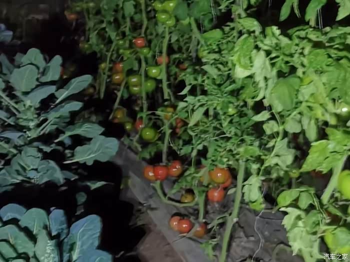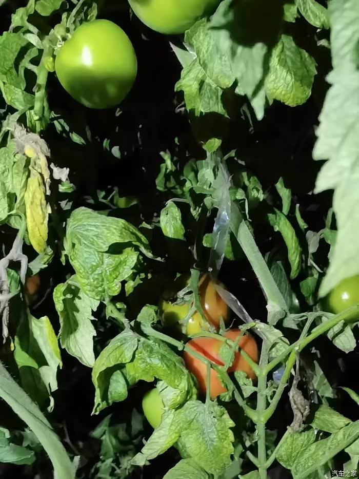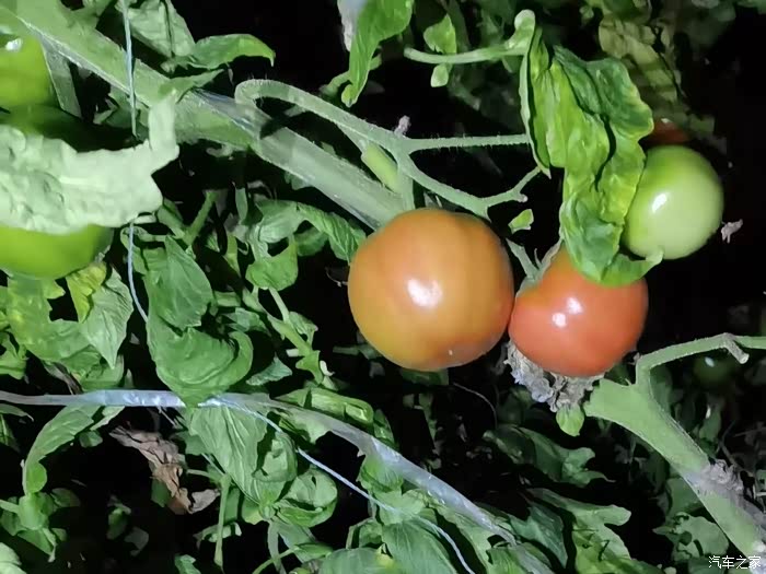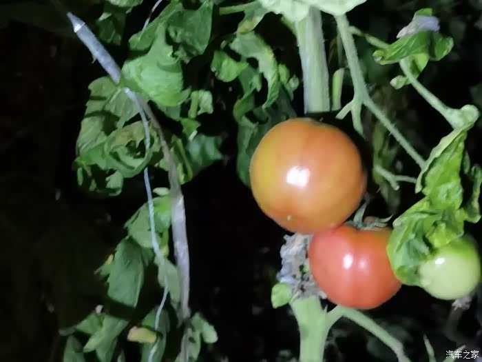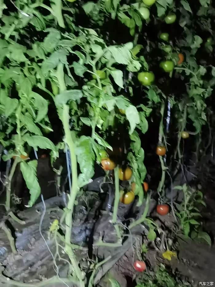 我们是吃完晚饭以后来的大棚,到的时候天已经黑了,虽然光线不是很好,但还是能够一眼就找到红彤彤的西红柿。