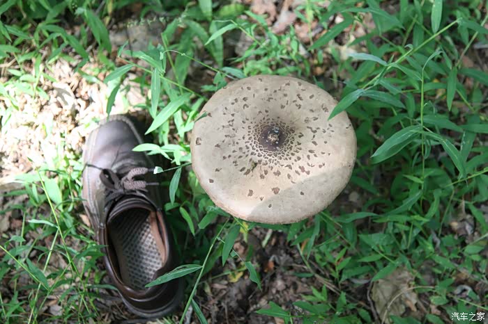 最神奇的发现,莫过于这个大蘑菇了。要说它有多大?找不到参照物,情急之下我只好脱下一只鞋子与之对比——本人鞋子41码!友情提示:经询问当地一位采蘑菇的小伙此为毒菇,万万不可食用!