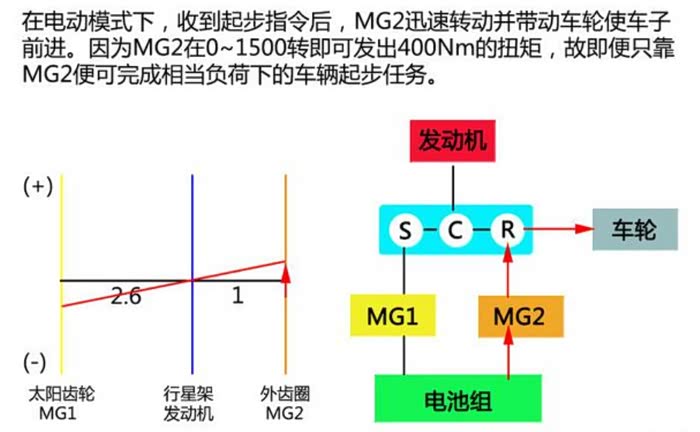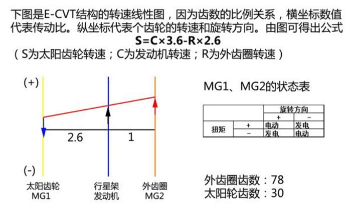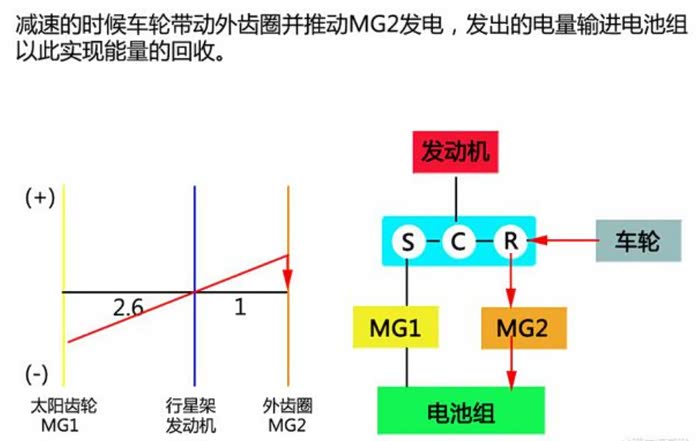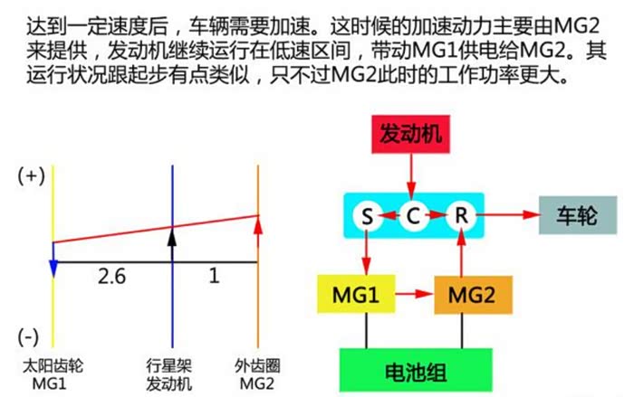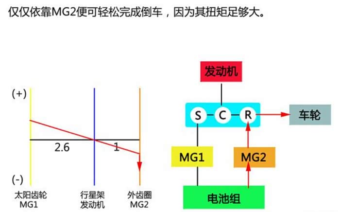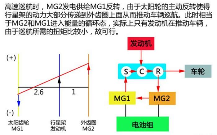 当外齿圈的转速高于行星架的转速时,即R》C时,明显S<0,即反转。但是如果此时的太阳轮的反转是空转(没有受任何阻力),那么其会转的飞快而使来自发动机的动力全部被MG1吸收而无法驱动外齿圈(因为驱动太阳轮明显比驱动外齿圈要容易得多)。故在这里会需要MG1工作在电动机模式,这样一来行星架就无法带动太阳齿轮高速飞转而浪费发动机的动力了。