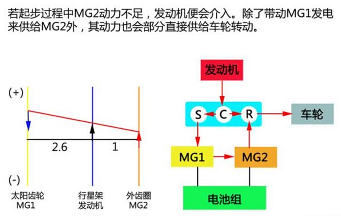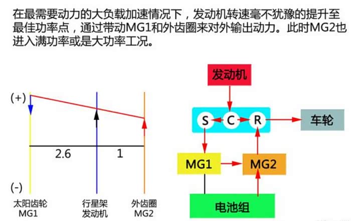 面对重负荷加速(如载重起动)等MG2的动力跟不上的情况。发动机转速提升,进入其经济运转区间,发动机的功率大大提升。因为发动机的扭矩提升进而带动MG1发电同时外齿圈获得的动力提升,同时时电池组也会向MG2供电,得益于此,MG2进入“火力全开”模式。