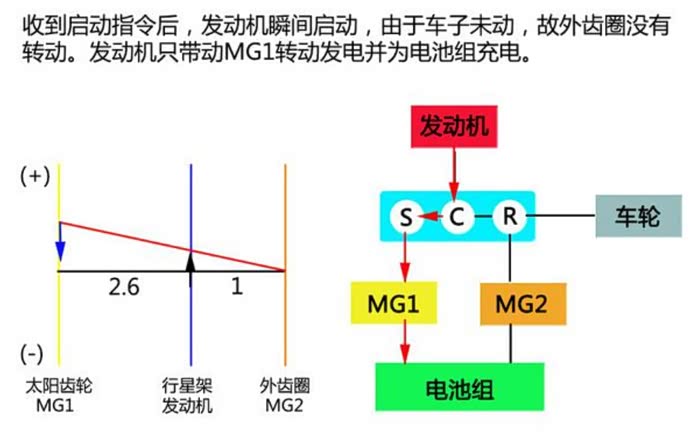 发动机启动后,怠速运转,汽油机带动行星座正向旋转。由于车轮(外齿圈)未转动,行星组盘(发动机)的正向旋转会通过行星齿轮而带动太阳齿轮(MG1)正向旋转。MG1不再接收电池组输电,反而变成发电机,发出交流电,经PCU里的逆变器和电压变换器变成低压直流电并给电池组充电。 总之,怠速时,发动机的功率全部用来为电池组充电。