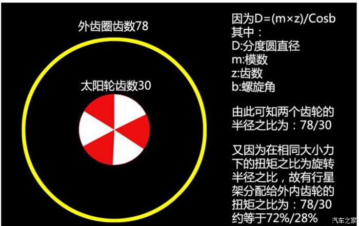 另外,由于外齿轮和太阳齿轮和行星齿轮的直径和齿数都已固定,根据图上的公式也可以得出:行星座在中间转动的时候分配给外齿圈和太阳轮的扭矩比是一定的。具体数值大约是72%分配给外齿轮(实际上是2.6÷3.6),28%分配给太阳齿轮(1-72%)。只要发动机转动做工,就不会改变这个基本事实。