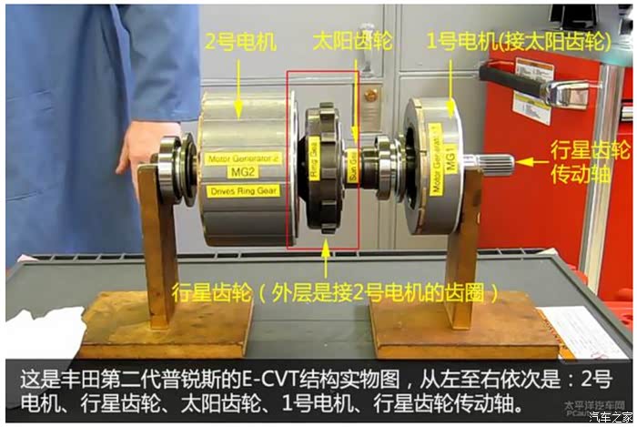 E-CVT的结构非常的简单,仅仅由外齿圈(这里的外齿圈同时连接2号电机和输出轴)和行星齿轮架(连接发动机)和太阳齿轮(连接1号电机)组成,即动力传递流为:2号电机—外齿圈—输出轴,同时由于行星齿轮组的存在,故亦有:发动机—行星组—外齿圈—输出轴。下面的实物图是某国外讲解视频截取下来的。