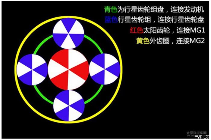 MG2:即二号电机(motor generator 2),与外齿圈相连。