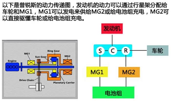 大部分情况下,MG2就能顺利的推动普锐斯加速到一个不错的速度,但是有些情况下也会出现动力不足的现象。这是发动机介入后便会通过带动MG1发电供给MG2和直接带动外齿轮转动来推动车轮两种方式来输出动力,值得一提的是,这两种方式可以同时存在。至于其互相占比多少取决于多种因素。