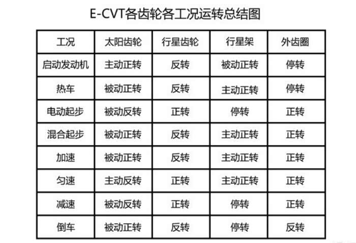 在整个普锐斯的行驶过程中我们可以看到,其实是两个电机和发动机互相配合,在严密的机电转换逻辑控制下完美进行线性输出的一个过程。而这种完美配合的基础就是E-CVT的特殊结构。因为功率=扭矩×转速,故这种扭矩按比例分配而转速又可以无极分配的行星齿轮组结构,使得发动机的动力可以随时随地无极分配给外齿圈(即车轮),完成普通步进式变速箱的所有功能!