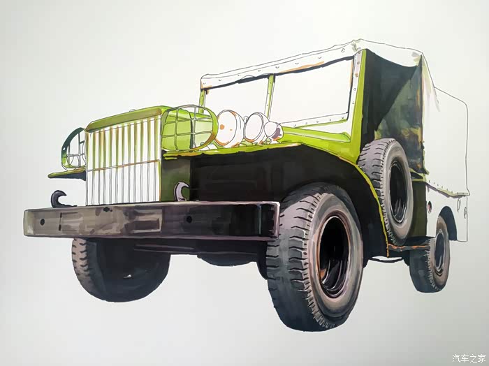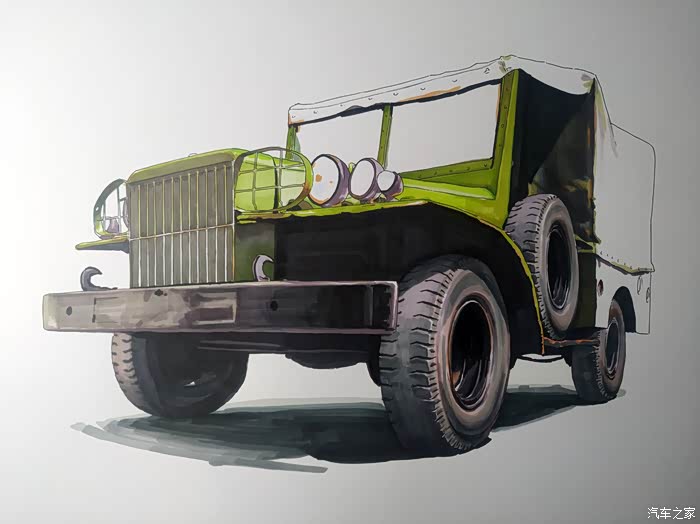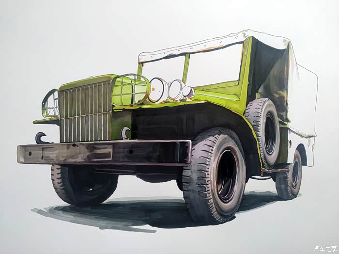 1942年美国通过《租借法案》向苏联提供道奇WC51、WC52、WC-53多用途车辆,马克笔手绘了一张,"中吉普"的道奇WC51中型越野车。苏联军人根据它的有效载荷0.75吨,称其为“道奇四分之三”。