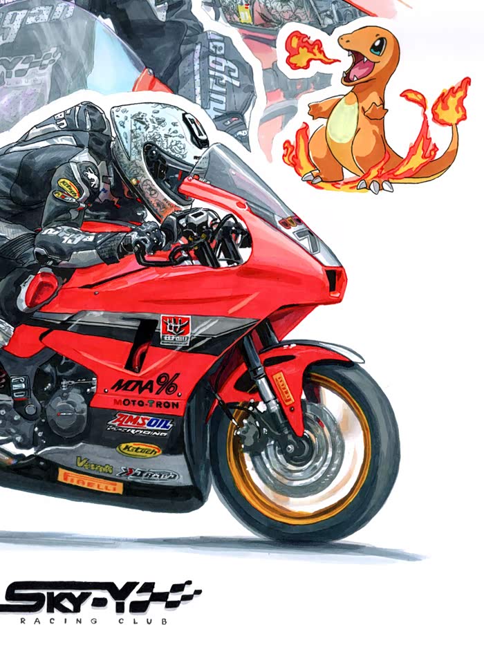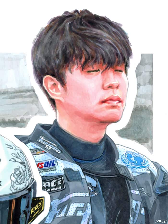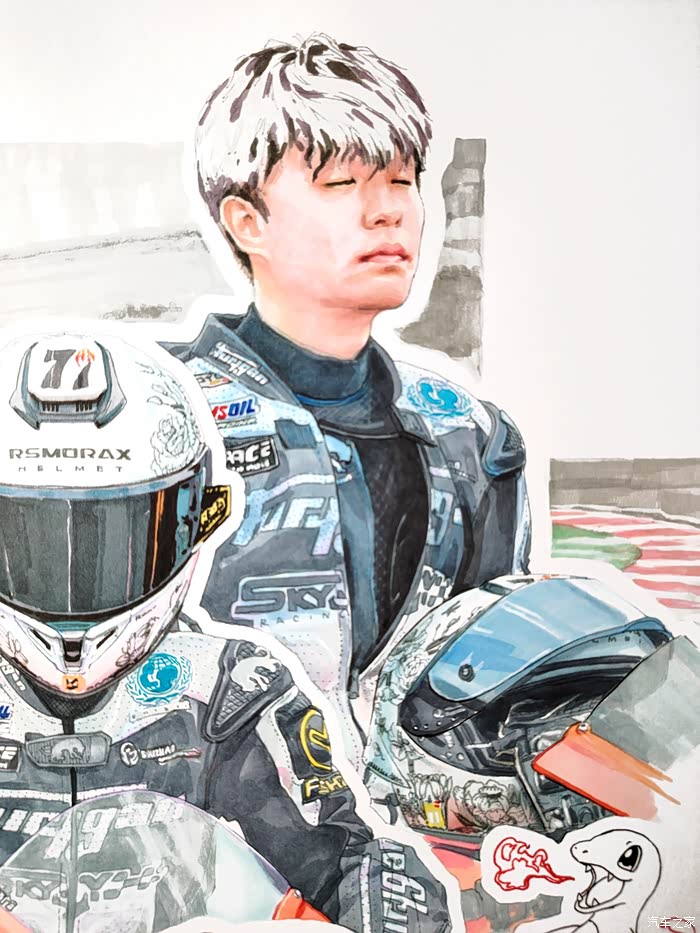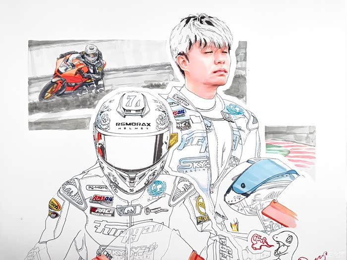 使用橙色马克笔为雅马哈R3的车身和赛道的主要部分涂上底色。注意要均匀涂抹,避免颜色溢出轮廓线,使用浅红色、浅蓝色等颜色的马克笔为车辆的某些部分(如车灯、轮毂等)添加细节色彩。人物以深灰色为主,从衣服配置到人物五官都需要精细~