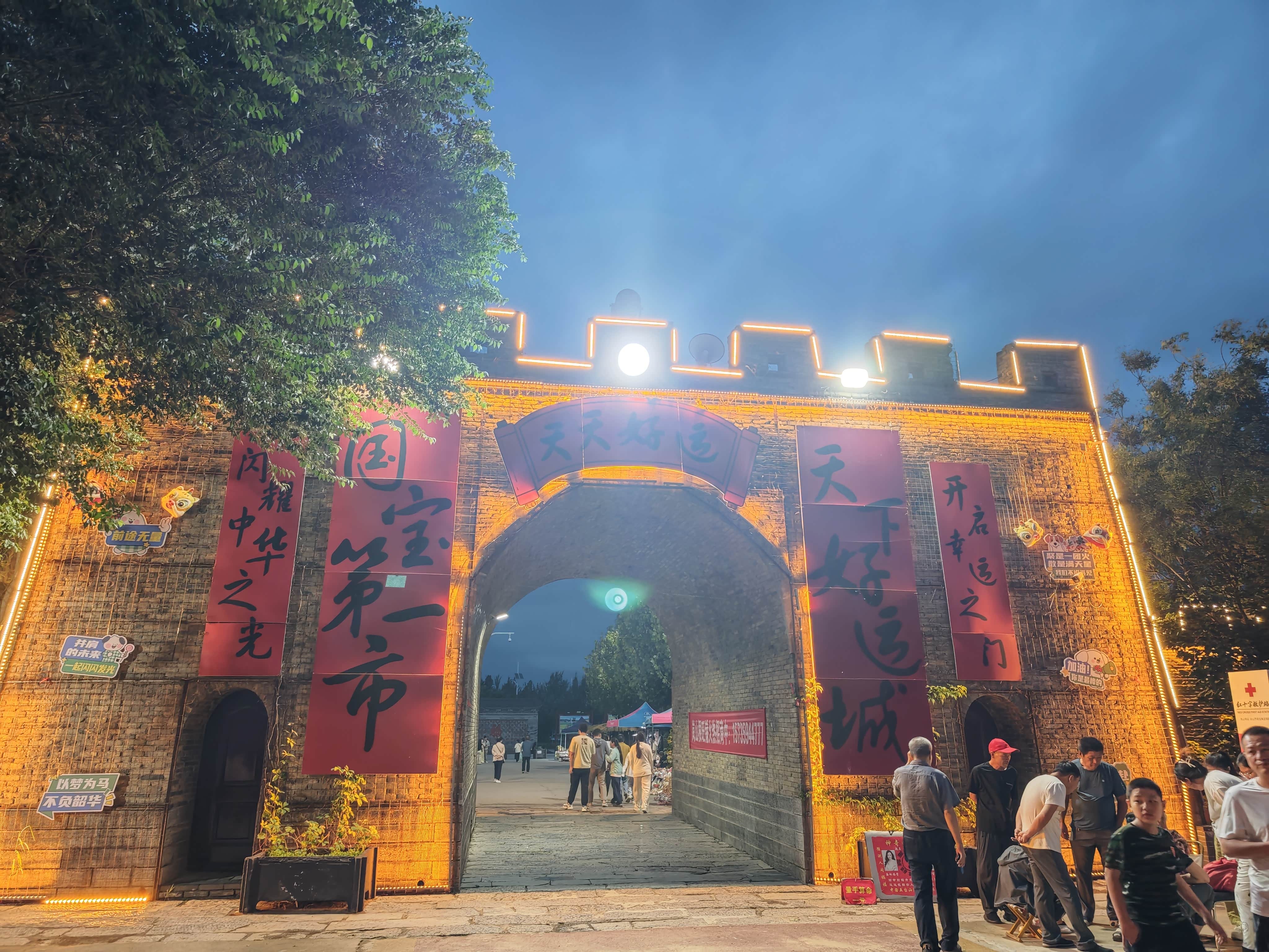 城楼顶部垛口整齐排列,中央射灯将“天天好运”的匾额照得金灿灿的——那抹红与黄,在深蓝夜幕下格外醒目。两侧城墙悬挂的标语“国宝第一市,闪耀中华之光”“天下好运城,开启幸运之门”,既是运城作为“中华文明重要发祥地”的底气,也暗合了游客对这场旅行的期待。穿过城楼,仿佛一脚踩进了旧时光里的市井。青砖木构的商铺沿街排列,